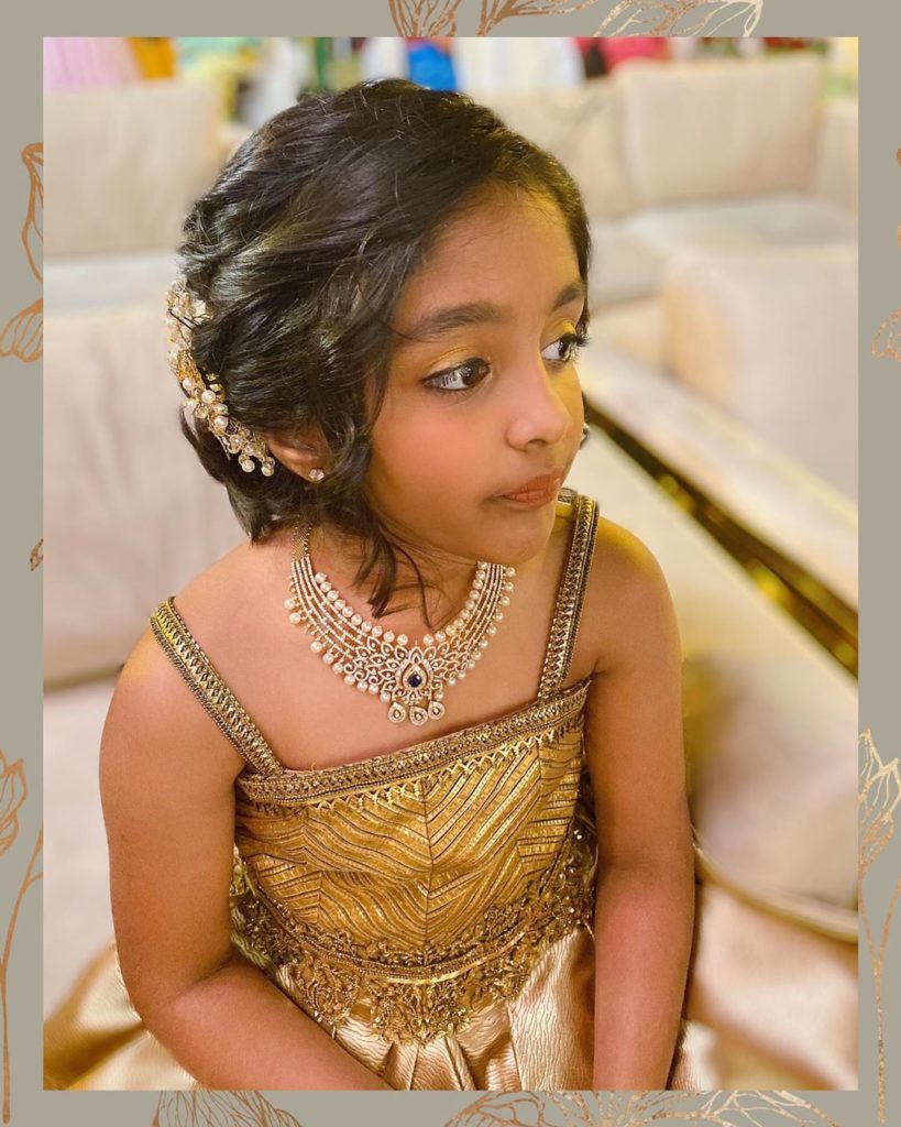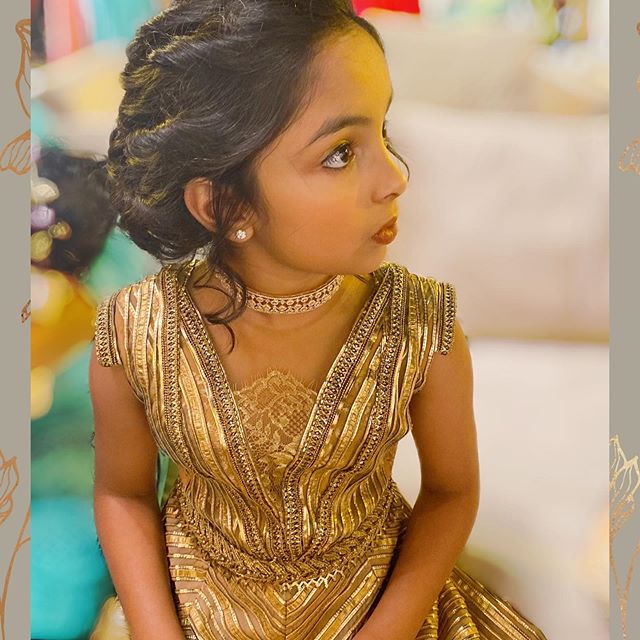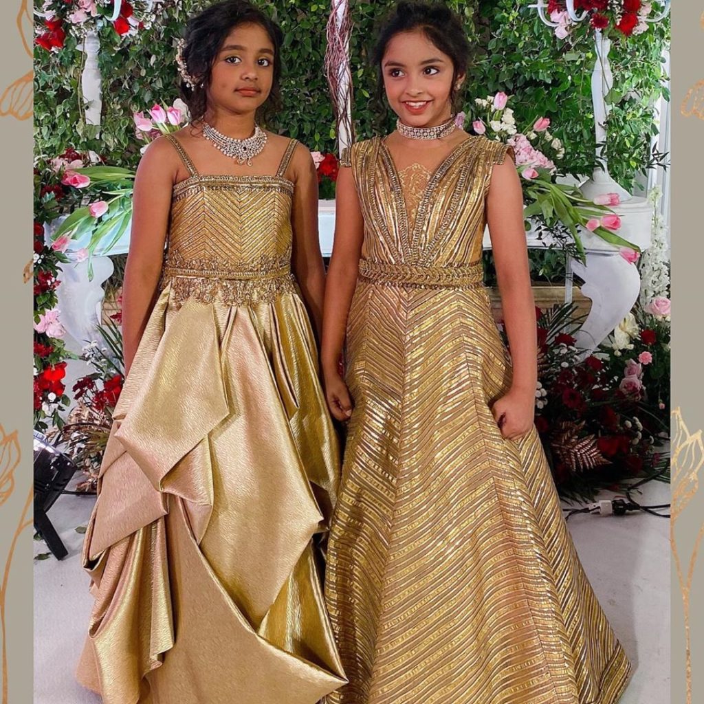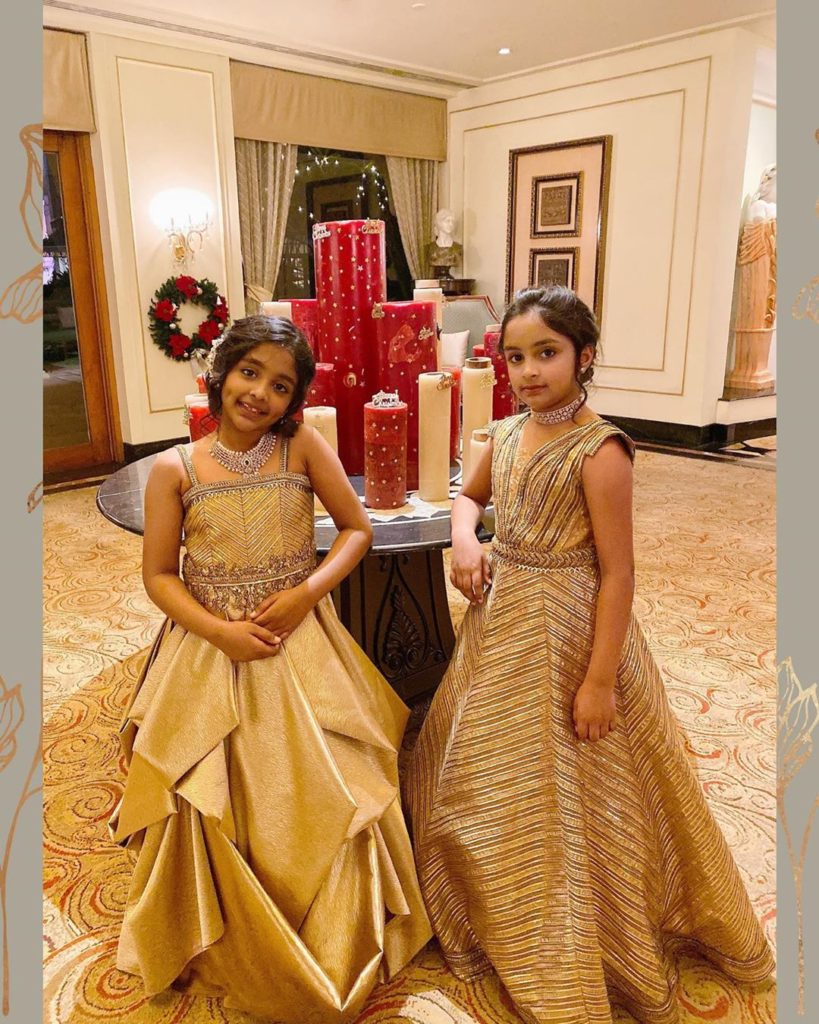Manchu Vishnu daughters Ariaana & Viviana looking beautiful in a gold colored embellished long gown from Shantanu & Nikhil,both the kids accessorized with diamond jewellery.