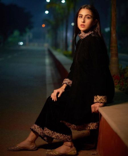 Sara ali khan in a Powder Pink by Sara Vaisoha high neck embroidery full sleeves malkhmal kurti paired […]