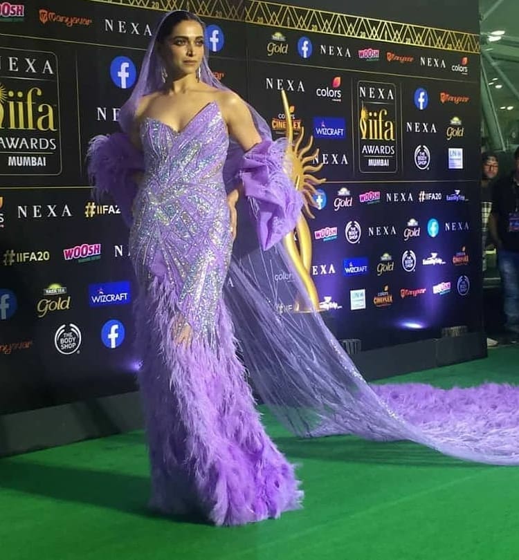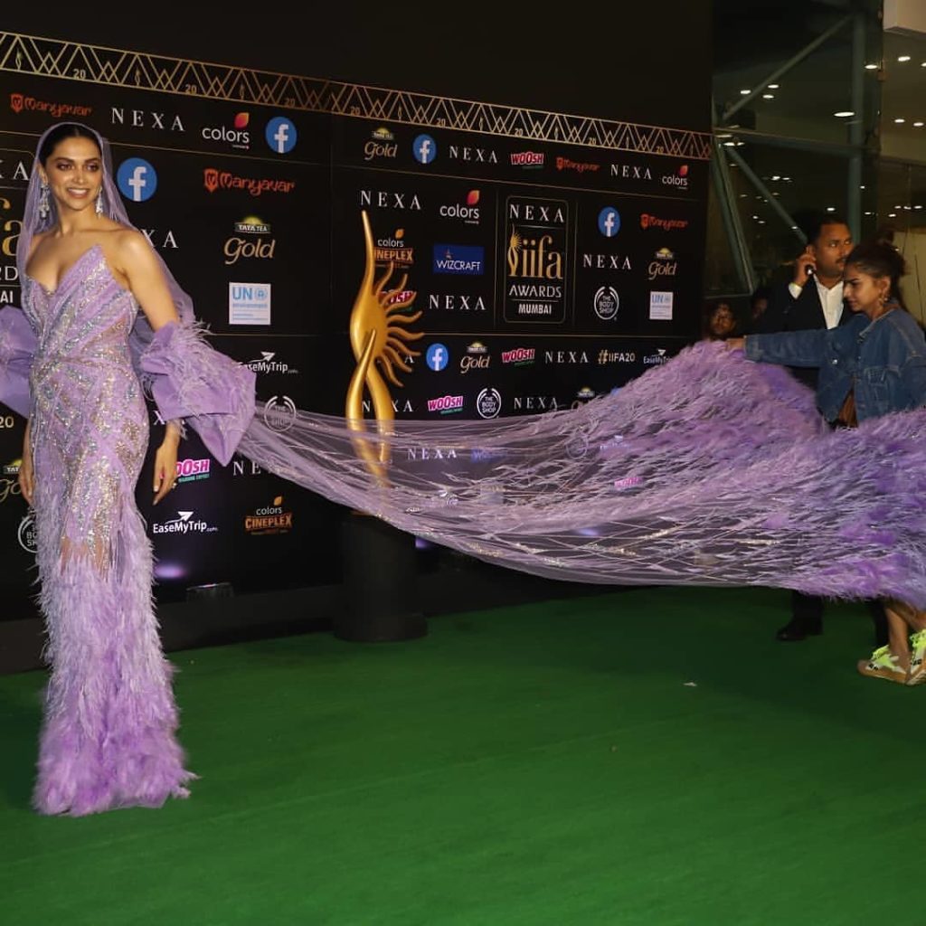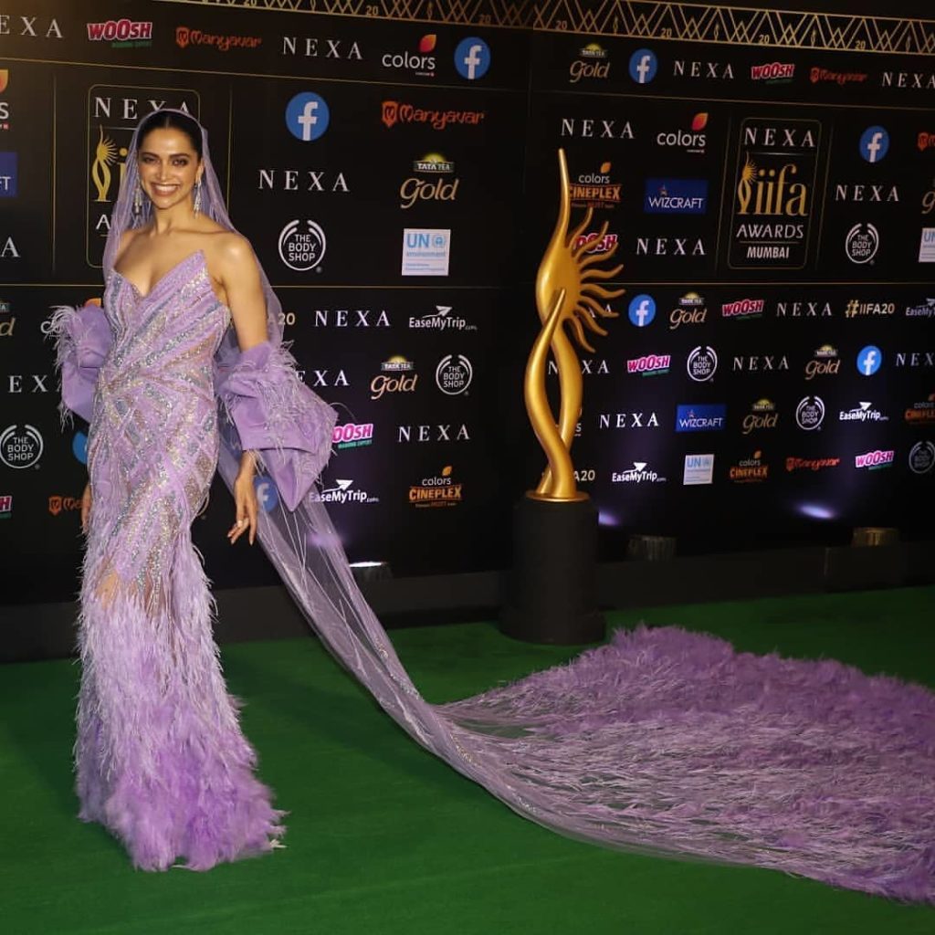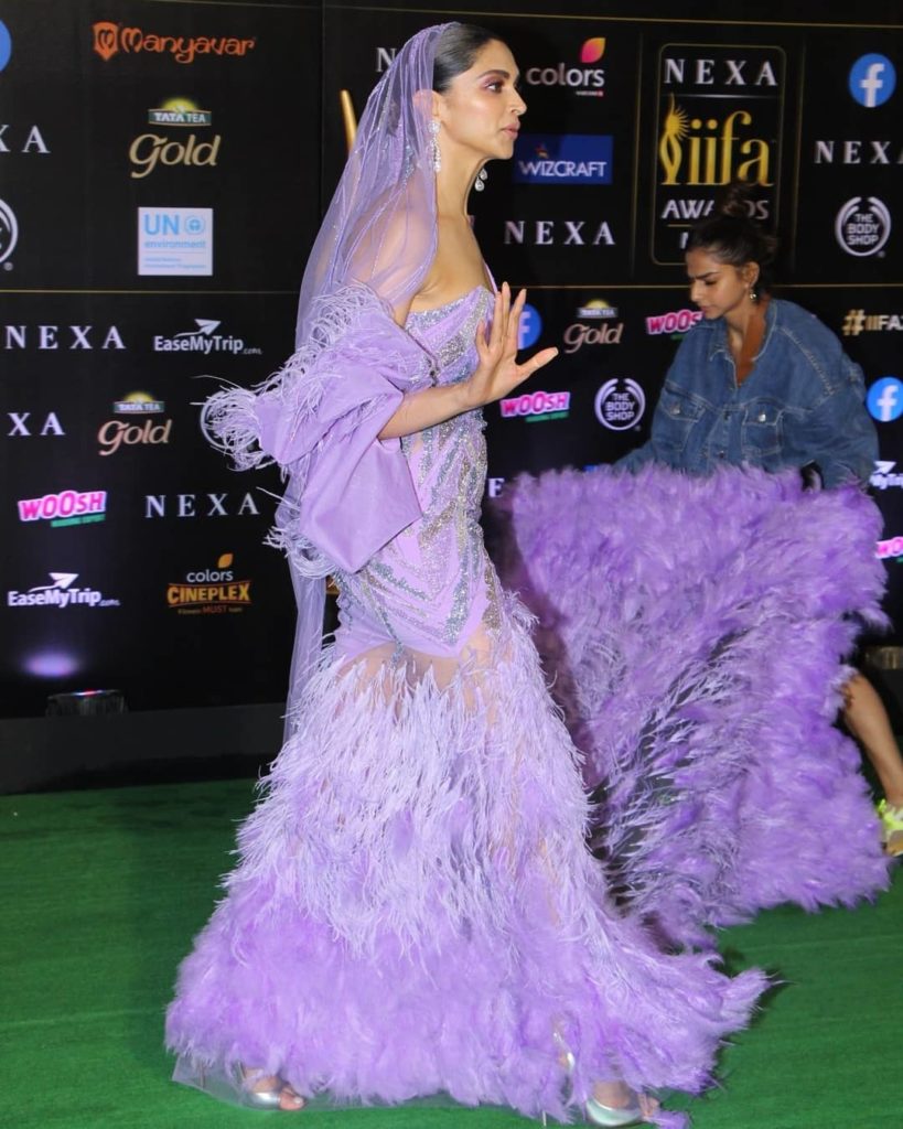 At IIFA Awards 2019 deepia padukone mesmerizing appearance in a Gurav Gupta’s couture feather embellished strapless gown with diamond earrings completed her look ,she looked gorgeous.