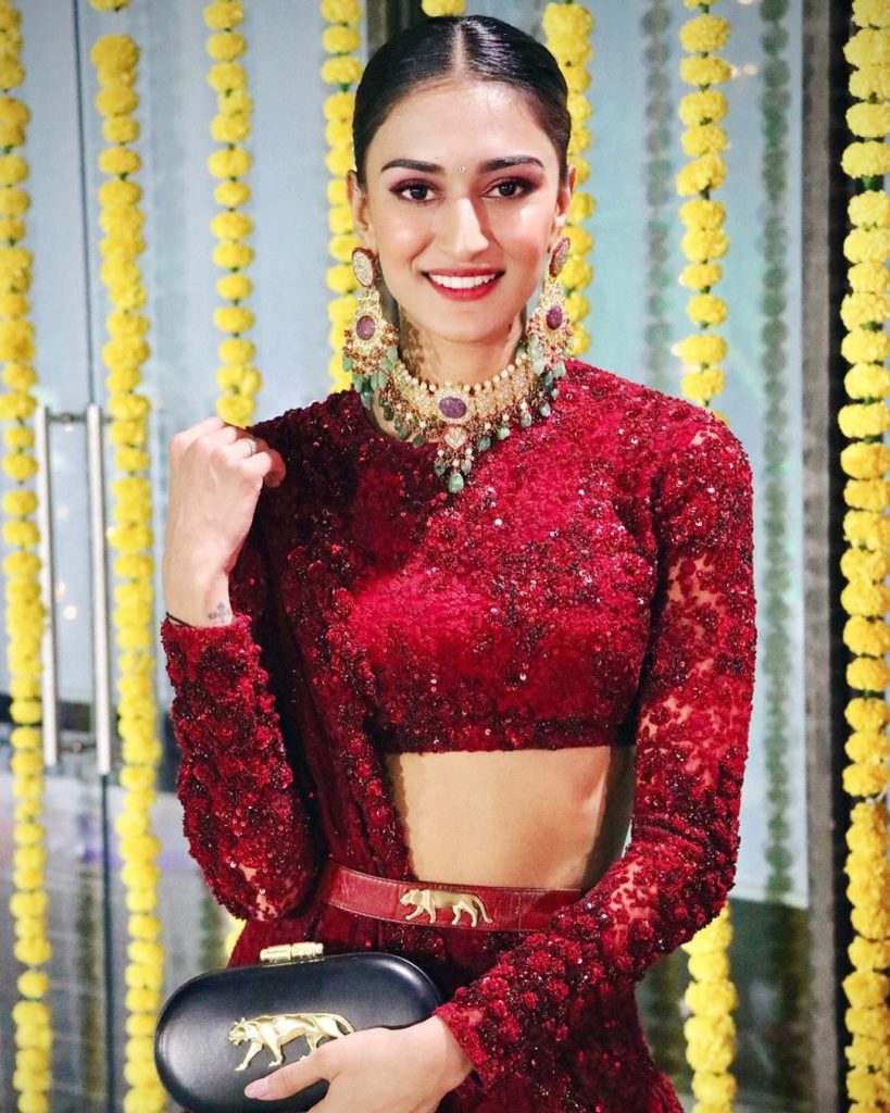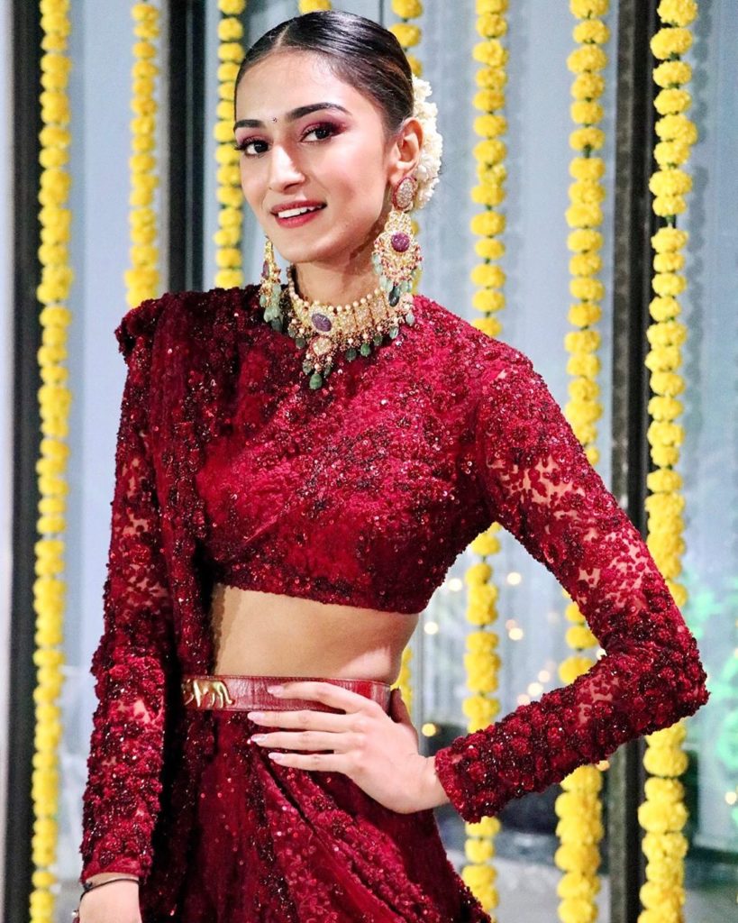 For a recent wedding event Erica Fernandes beautiful appearance in a sabyasachi couture embroidery skirt and full sleeves embroidery crop top and matching dupatta she finished off her look with Tyaani by Sabyasachi Jewellery.