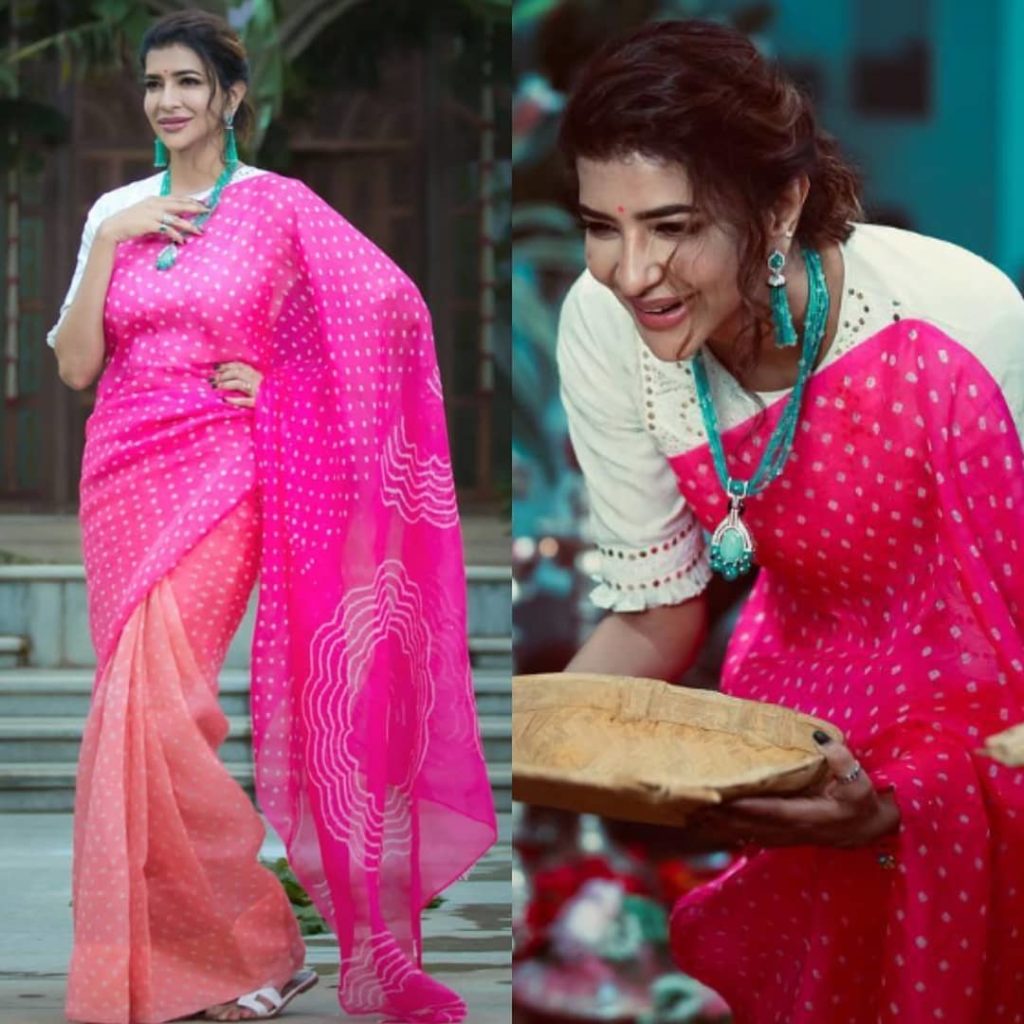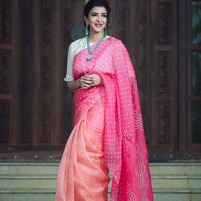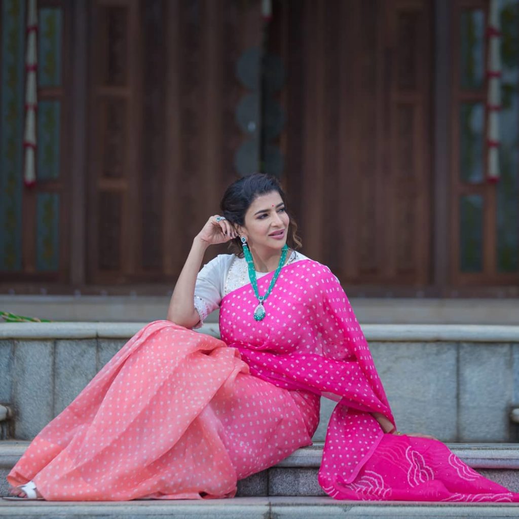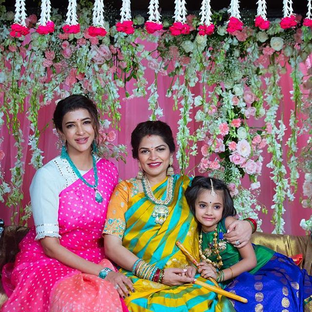 For Viranica Manchu Seemantham function Lakshmi Manchu pretty appearance in a badhani saree from Naina Jain Couture she looked beautiful emerald beads chains with earrings completed her look.
