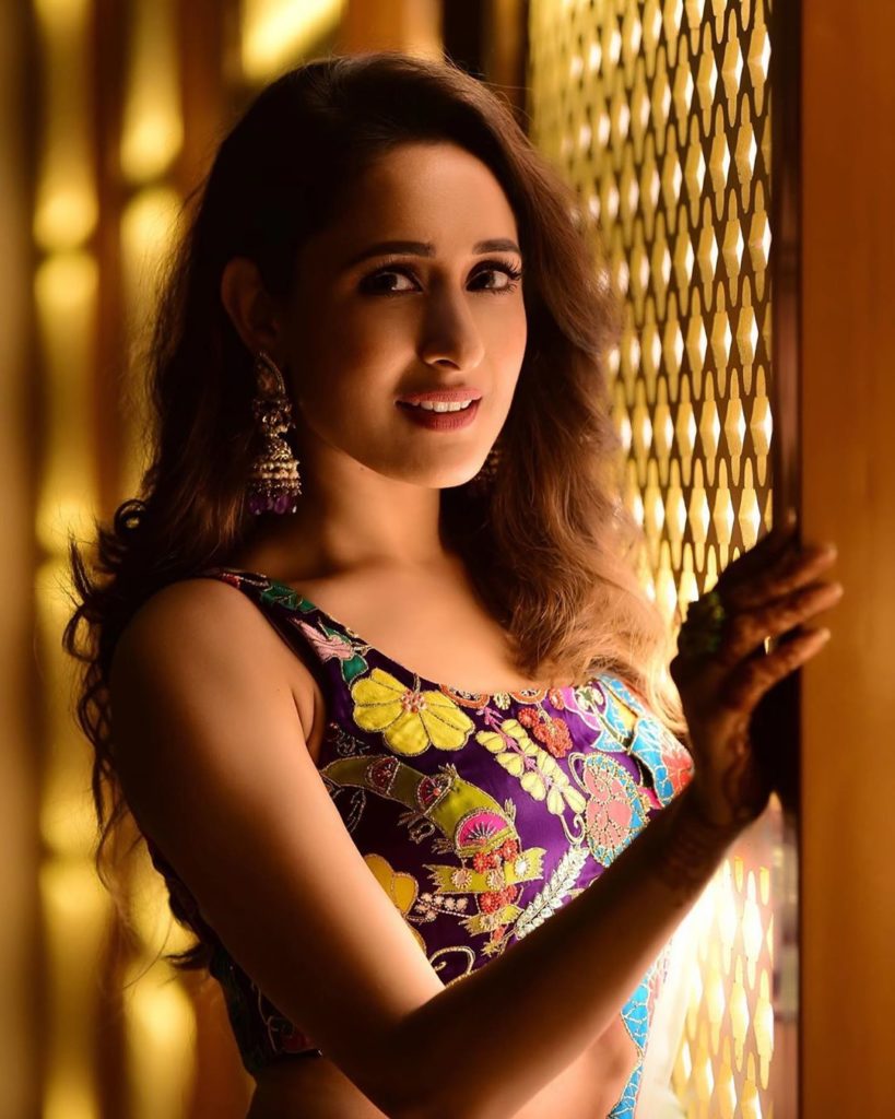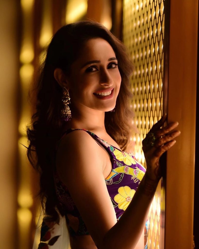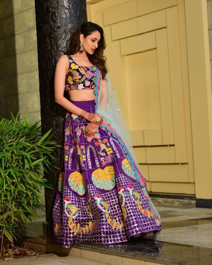 At her sister’s wedding function Pragya Jaiswal beautiful appearance in a Aisha Rao violet color embroidery skirt with embroidery crop top and netted dupatta she finished of her look with minerali store earrings.