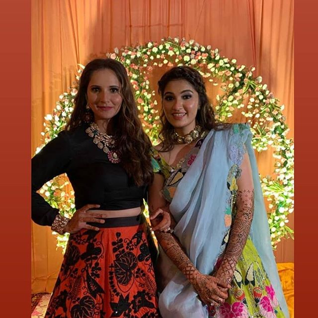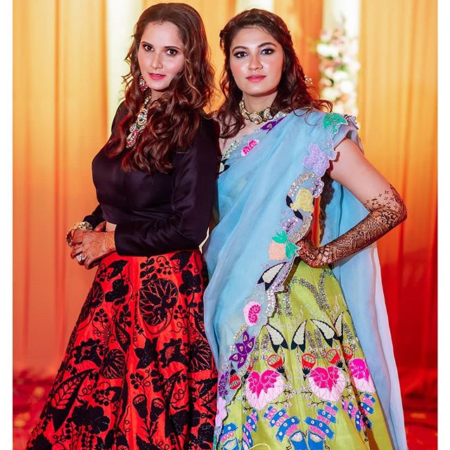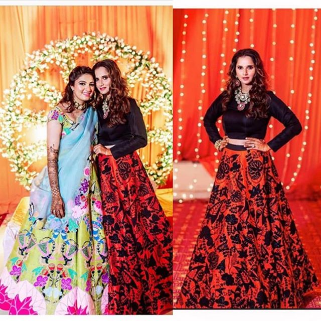 For her sister Mehendi ceremony Sania Mirza donned a red and black printed skirt paired with black full sleeves crop top from Aisha Rao label Razwada jewellery completed her look.