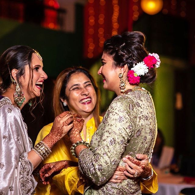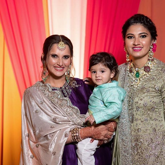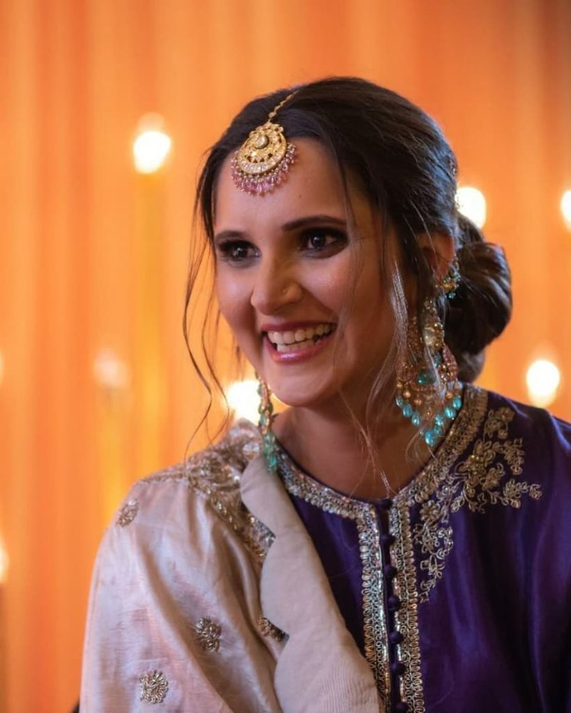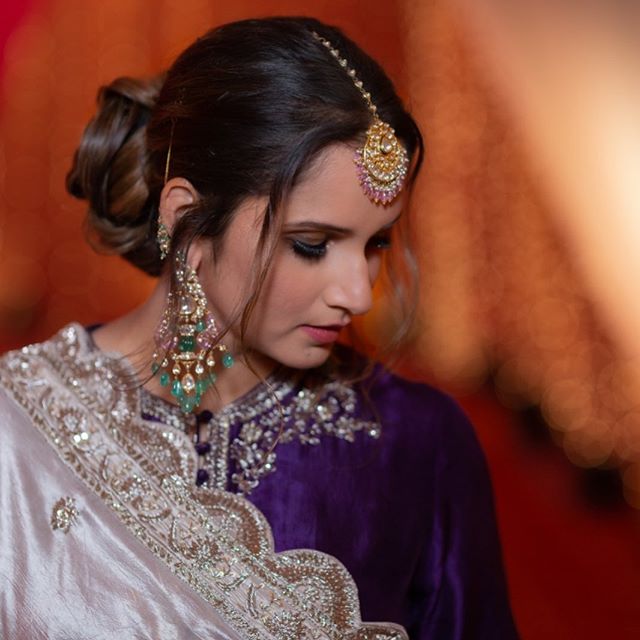 For her sister Anam Mirza wedding ceremony Sania Mirza glows in a Jayanti Reddy Couture skirt with contrast full sleeves blouse and embroidery dupatta she completed her look with Razwada maang tikka and earrings ,she looked good.