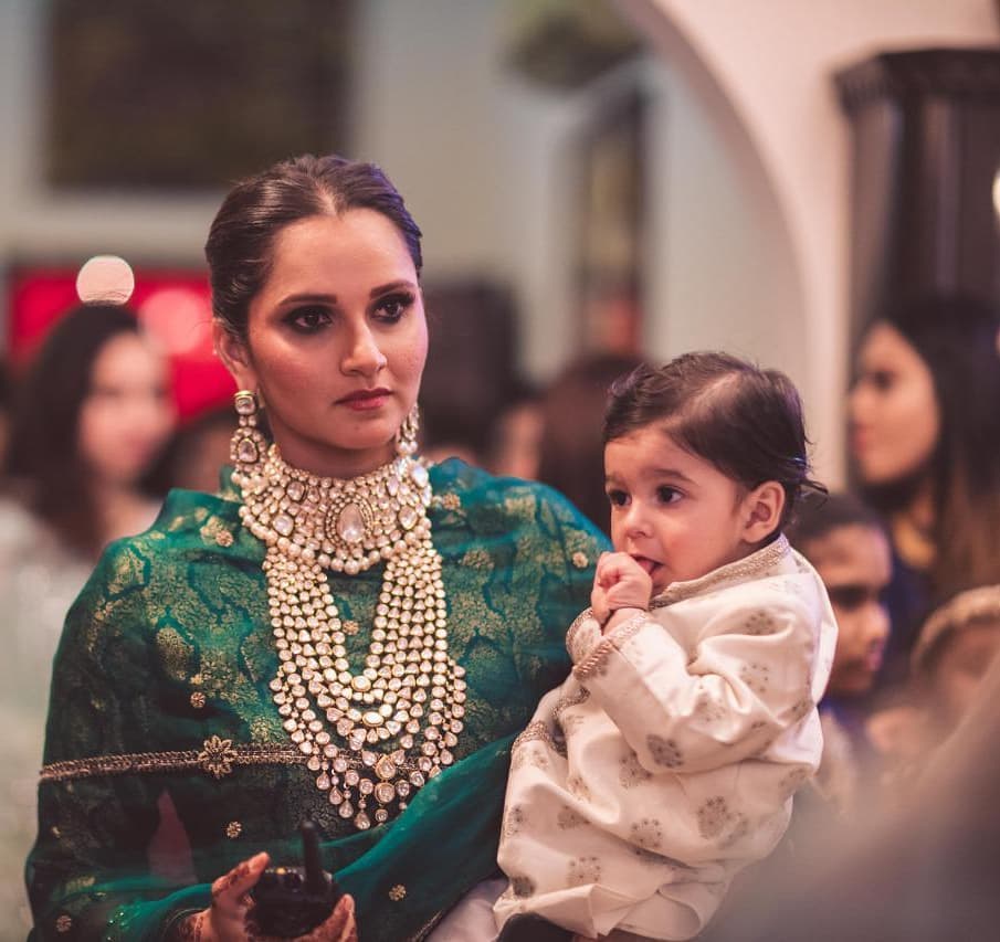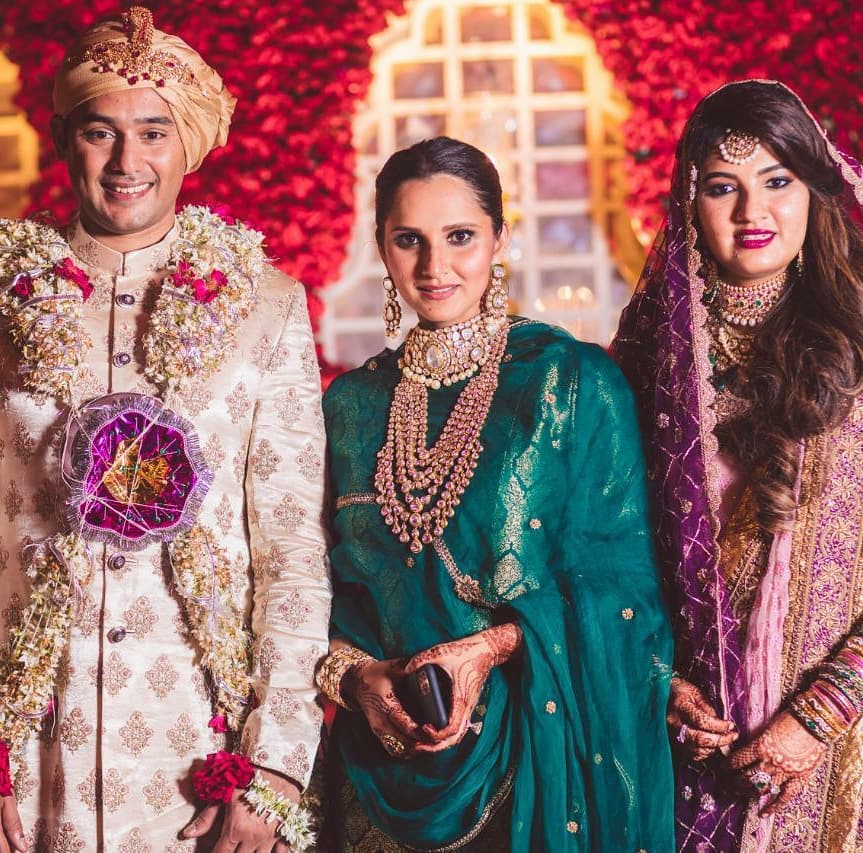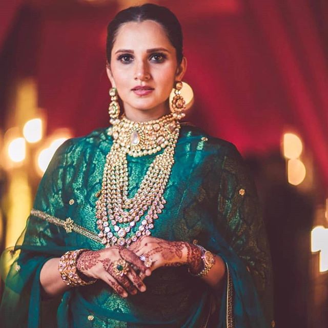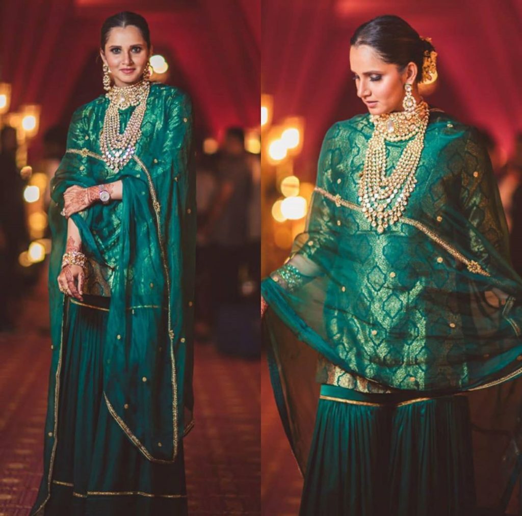 For her sister wedding ceremony Sania Mirza elegant appearance in a green sharara suit from Raw Mango couture polki kundan choker and multi layered kundan haram with matching earrings and kada rounded out her look.