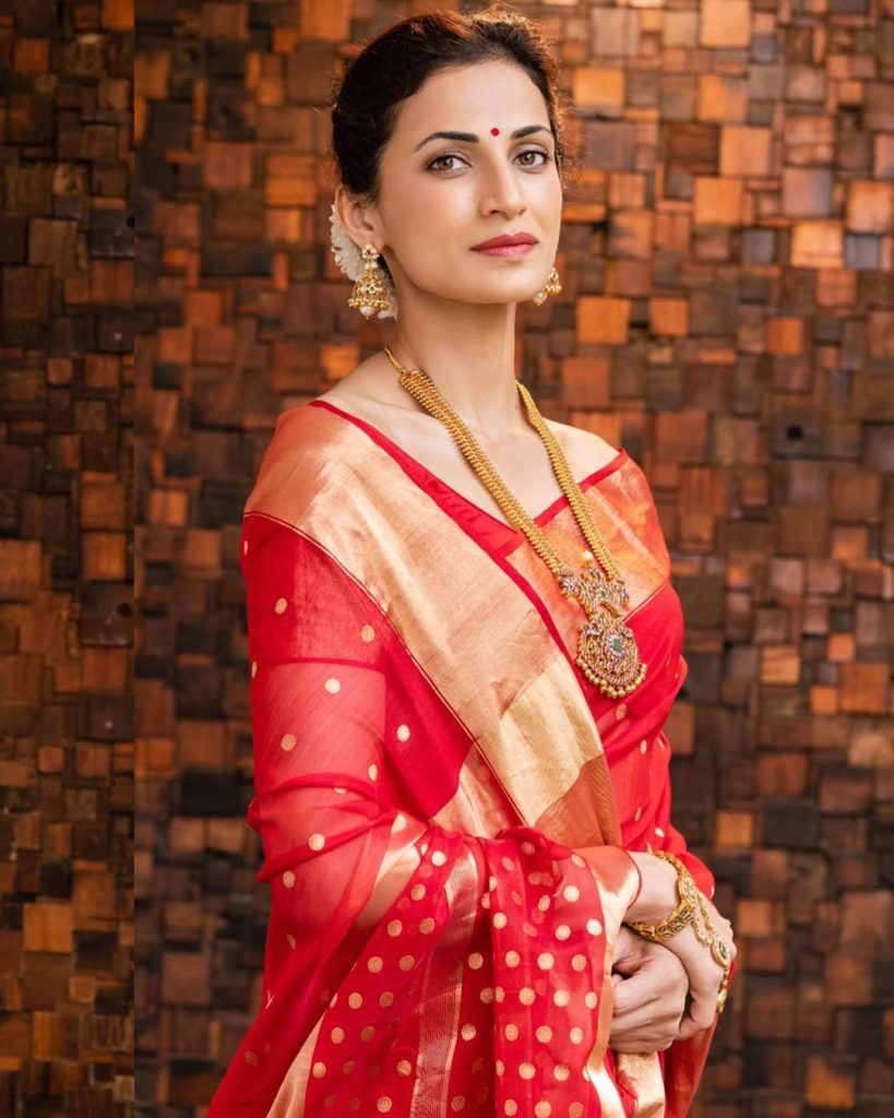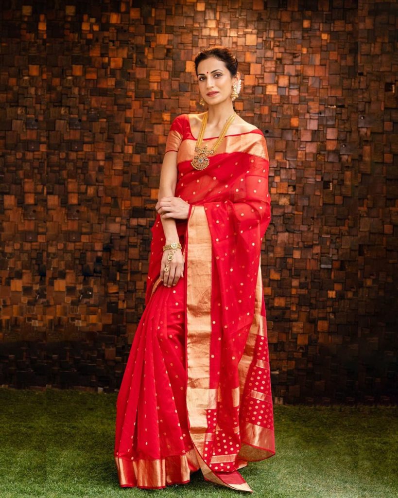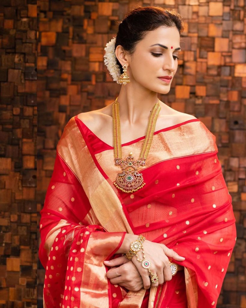 Shilpa Reddy regal look in a red polka dots saree with zari border with matching short sleeves blouse,she finished of her look south indian jewellery.