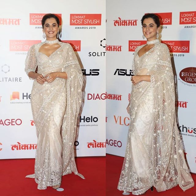 Lokmat stylish awards 2019 event Taapsee striking appearance in a white crystal embroidery glittering saree from Falguni and Shane Peacock teamed with a matching embroidery blouse,she finished of her look with diamond earrings.